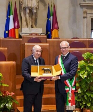 وكرم الرئيس تبون على هامش هذه الزيارة من قبل عمدة بلدية روما روبيرتو غوالتيري برمز مدينة روما “LA LOUVE” .
