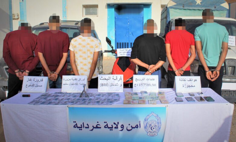 تمكنت فرقة البحث و التدخل التابعة للمصلحة الولائية للشرطة القضائية بغرداية من الإطاحة بشبكة إجرامية تعمل على تقليد وتزوير وتزييف أوراق نقدية من العملة الوطنية ذات سعر قانوني لغرض طرحها للتداول بصفة غير قانونية، أين تم حجز أوراق نقدية مزورة، عائدات ترويج و مقابل تداول هذه الأوراق، مركبتين و دراجة نارية، مع توقيف ستة (06) أشخاص تتراوح أعمارهم بين 24 و 37 سنة قدموا أمام الجهات القضائية.