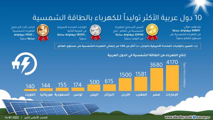 أظهرت إحصاءات حديثة أن الإمارات تتصدر الدول العربية في توليد الطاقة الكهربائية من الطاقة الشمسية، تليها مصر والمغرب والأردن، ثم الجزائر واليمن وتونس والسعودية وموريتانيا، لتأتي الكويت أخيرة ضمن العشر الأوائل على هذا الصعيد، علما أن أزمة الطاقة وغلاء الوقود يدفعان إلى تسريع خطى الاعتماد على مصادر الطاقة البديلة النظيفة والمتجددة بدلا من المحروقات التقليدية الآتية من الوقود الأحفوري.