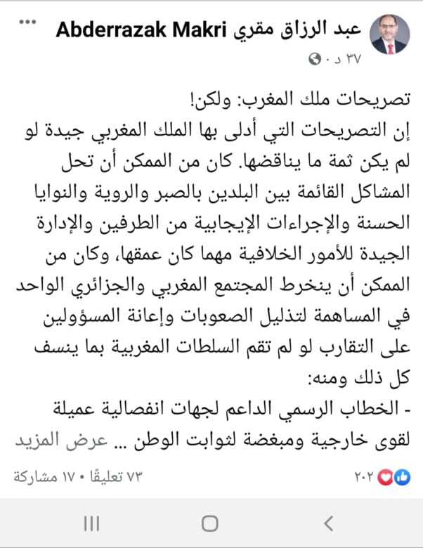 قال عبد الرزاق مقري في بيان على صفحته بموقع فايسبوك: إن التصريحات التي أدلى بها الملك المغربي جيدة لو لم يكن ثمة ما يناقضها. كان من الممكن أن تحل المشاكل القائمة بين البلدين بالصبر والروية والنوايا الحسنة والإجراءات الإيجابية من الطرفين والإدارة الجيدة للأمور الخلافية مهما كان عمقها، وكان من الممكن أن ينخرط المجتمع المغربي والجزائري الواحد في المساهمة لتذليل الصعوبات وإعانة المسؤولين على التقارب لو لم تقم السلطات المغربية بما ينسف كل ذلك”.