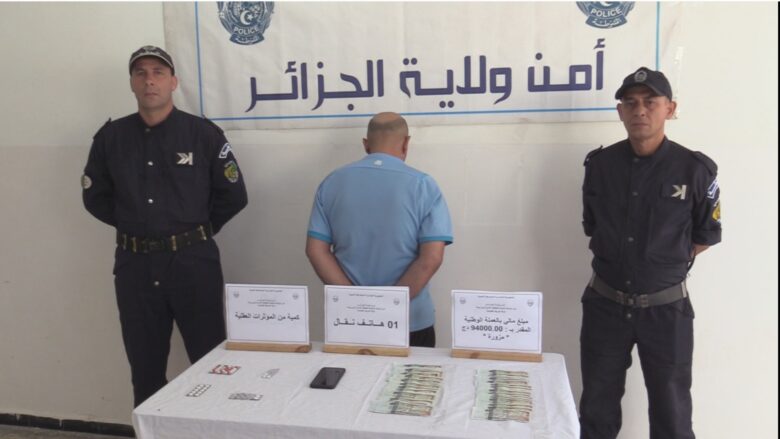 تحت الإشراف الدائم للنيابة المختصة إقليميا، تمكن خلالها عناصر الفرقة من توقيف المشتبه فيه الذي يبلغ من العمر 54 سنة، ينحذر من ولاية الجزائر، مسبوق قضائيا، وبعد عملية الملامسة القانونية تم ضبط بحوزته على مبلغ مالي في شكل أوراق نقدية مزورة بالعملة الوطنية من فئة (2000)دج تقدر قيمته بـ (9.4) مليون سنتيم، كمية من المؤثرات العقلية وهاتف نقال.