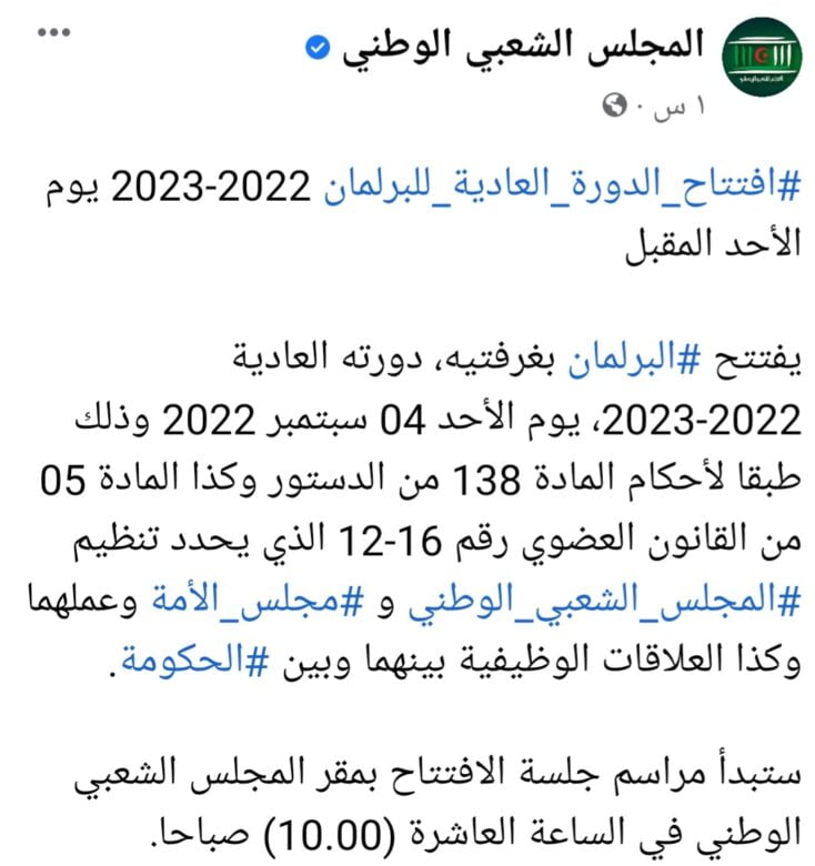 أعلن البرلمان بغرفتيه، اليوم الأربعاء، عن افتتاح دورته التشريعية العادية 2022-2023 يوم الأحد المقبل.