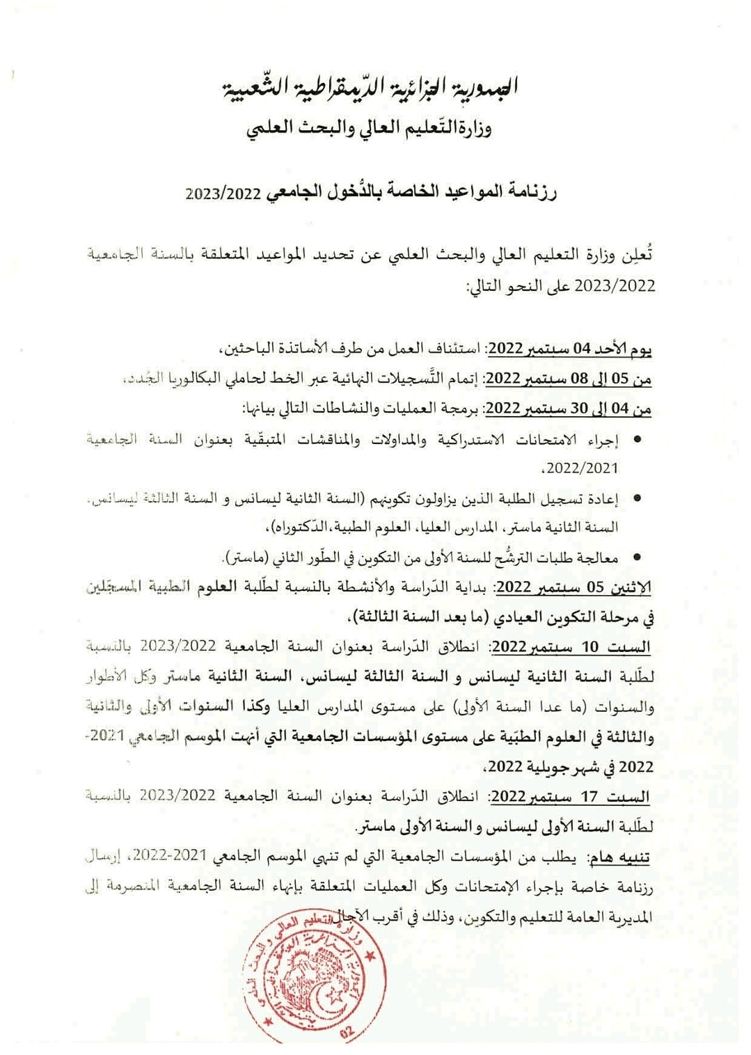 أعلنت وزارة التعليم العالي والبحث العلمي عن رزنامة التسجيلات والمواعيد الخاصة بالدخول الجامعي 2022-2023، والذي ينطلق رسميا بداية من الأحد 4 سبتمبر الجاري.