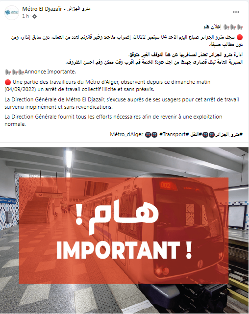 اعتذرت إدارة شركة مترو الجزائر عن الإضراب المفاجئ الذي قام به عدد من عمالها، صباح اليوم الأحد، والذي تسبب في تعطل الرحلات المعتادة.