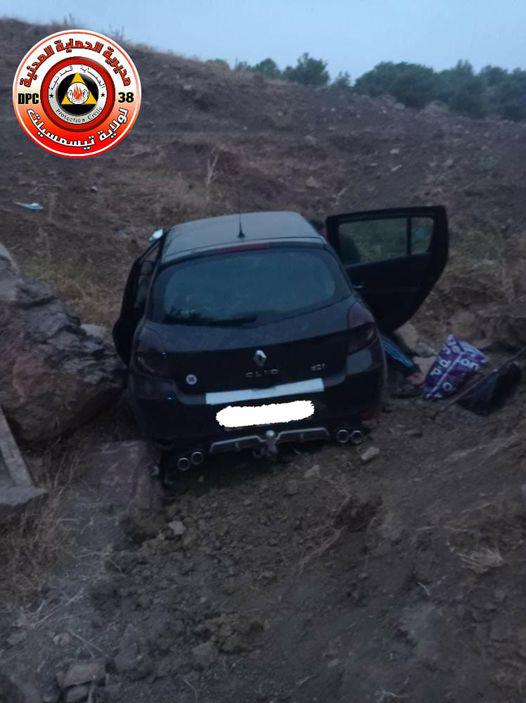 من جهتها تدخلت وحدات الحماية المدنية لولاية تيسمسيلت بالطريق الولائي رقم 05 وبالتحديد بدوار أولاد بوضاف التابع إقليميا لبلدية بني شعيب دائرة برج بونعامة من أجل حادث مرور تمثل في انحراف سيارة واصطدامها بحاجز إسمنتي. أسفر عن وفاة شاب عمره 33 سنة بمكان الحادث وإصابة شخصين تتراوح أعمارهما 48 و62 سنة يعانيان من إصابات متفاوتة الخطورة تم إسعافهما وتحويلهما نحو مصلحة الاستعجالات بمستشفى برج بونعامة.