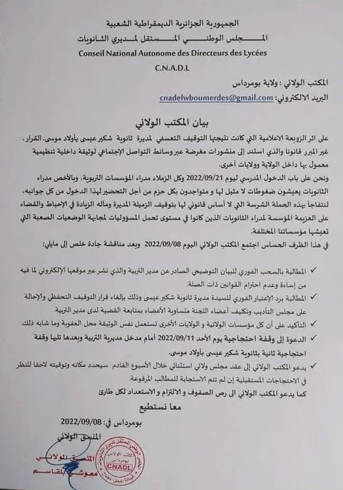 طالب المجلس الوطني المستقل لمديري الثانويات برد الاعتبار لمديرة ثانوية شكير عيسى ببومدراس المقالة بعد قضية استمارة الفقر والغنى التي أحدثت ضجة عبر مواقع التواصل.