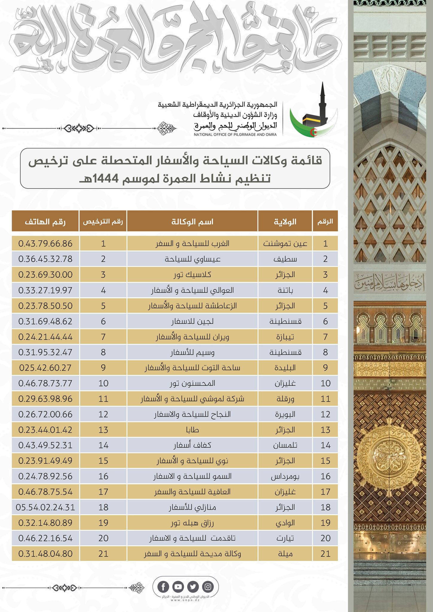 أفرج الديوان الوطني للحج والعمرة عن قائمة وكالات السياحة والأسفار المتحصلة على ترخيص تنظيم نشاط العمرة لموسم 1444ه