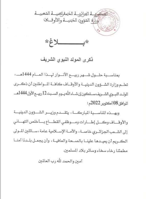 وزارة الشؤون الدينية تعلن عن موعد المولد النبوي الشريف للعام 1444ه