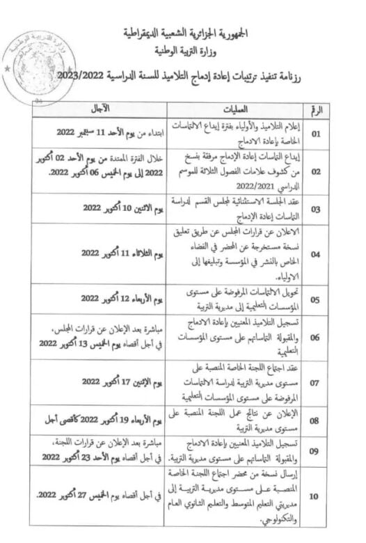 أفرجت وزارة التربية الوطنية عن رزنامة إعادة إدماج التلاميذ للسنة الدراسية 2022-2023 بداية من الالتماسات وصولا إلى التحاقهم بمقاعد الدراسة.