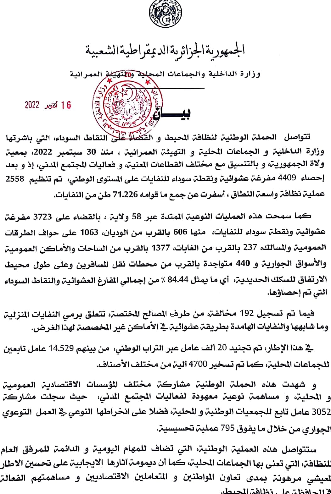 أحصت وزارة الداخلية أكثر من 4 آلاف مفرغة عشوائية ونقطة سوداء عبر مختلف الولايات، كما قامت بجمع 70.226 طن من النفايات منذ انطلاق الحملة الوطنية للنظافة.