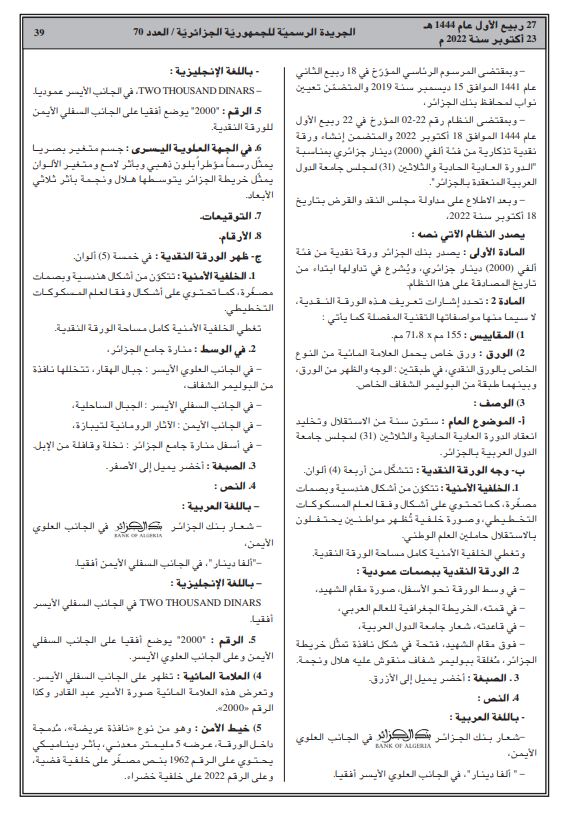 وصدر في العدد 70 من الجريدة الرسمية رقم نظام يتضمن إنشاء ورقة نقدية تذكارية من فئة ألفي 2000 دينار جزائري بمناسبة “الدورة العادية الحادية والثلاثين 31 لمجلس جامعة الدول العربية المنعقدة بالجزائر”.