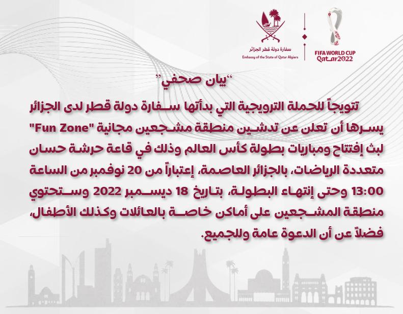 أعلنت سفارة دولة قطر لدى الجزائر، عن تخصيص السفارة لمنطقة مشجعين مجانية أمام الجمهور الجزائري لمتابعة مباريات كأس العالم التي تحتضنها لأول مرة دولة عربية هي الشقيقة قطر.
