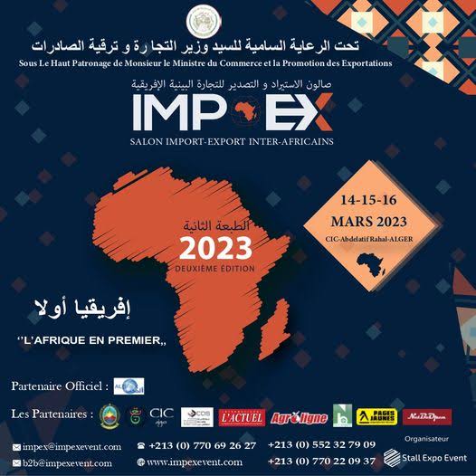 ستنظم الطبعة الثانية من صالون الاستيراد والتصدير البيني الافريقي (ايمبكس 2023) من 14 الى 16 مارس المقبل على مستوى المركز الدولي للمؤتمرات “عبد اللطيف رحال” بالجزائر العاصمة.