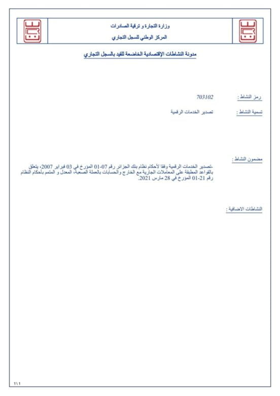 ويمكن للراغبين في ممارسة نشاط تصدير الخدمات الرقمية، والاستفادة من مداخيلهم كاملة بالعملة الصعبة، القيد في السجّل التجاري، في إطار نشاط “تصدير الخدمات الرقمية” الذي يرمز له بالرقم 703102.
