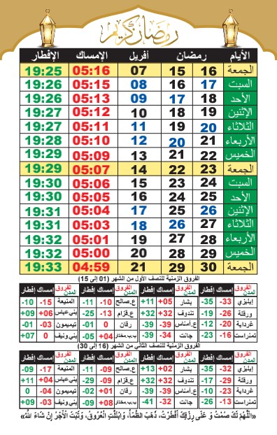 أما ولاية بسكرة، المرتبطة بتوقيت ولاية الجلفة، فسيكون الموعد فيها 10 دقائق قبل الجلفة بالنسبة للإمساك، و9 دقائق قبل نفس الولاية بالنسبة للإفطار.