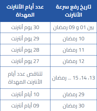 وتابع البيان انه اذا تم رفع سرعة الأنترنت في اليوم العاشر، فإنكم ستتحصلون على 29 يوم أنترنت مهداة. بعد ذلك، تتناقص قيمة االهدية (عدد أيام الأنترنت المهداة) يوميا مع مرور أيام رمضان، وذلك وفقا للتاريخ الذي قمتم فيه برفع سرعة الأنترنت، كما هو موضح في الجدول الآتي: