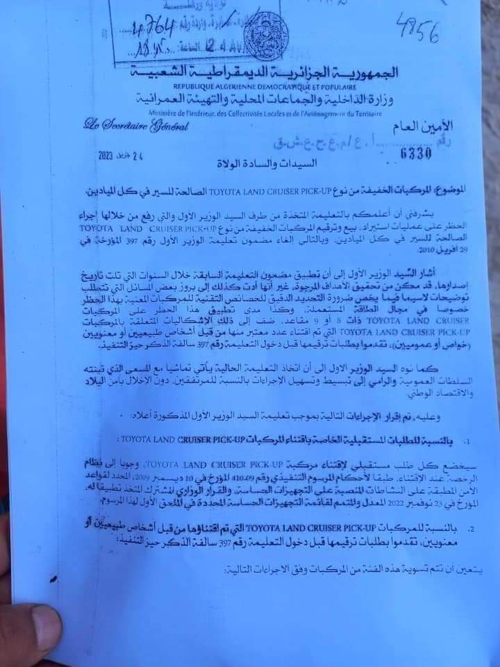 وجاء في برقية متداولة لوزارة الداخلية موجّهة إلى الولاة، تعليمة للوزير الأول تقرّ برفع إجراء الحظر عن عمليات استيراد وبيع وترقيم المركبات الخفيفة من نوع بيك آب وكرورز وتويوتا الصالحة للسير في كل الميادين، وهو ما يعني إلغاء مضمون تعليمة الوزير الأول رقم 397 المؤرخة في 29 أفريل 2010.