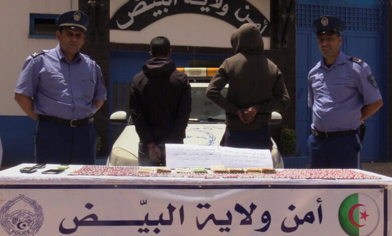 تمكنت مصالح الأمن الحضري الأول بأمن ولاية البيـــض ، من حجز 1015 كبسولة من المؤثرات العقلية نوع بريقاباليـن 300 ملغ ،ة مع توقيف شخصين مشتبه فيهما ،يبلغان من العمر27 و 30 سنة .