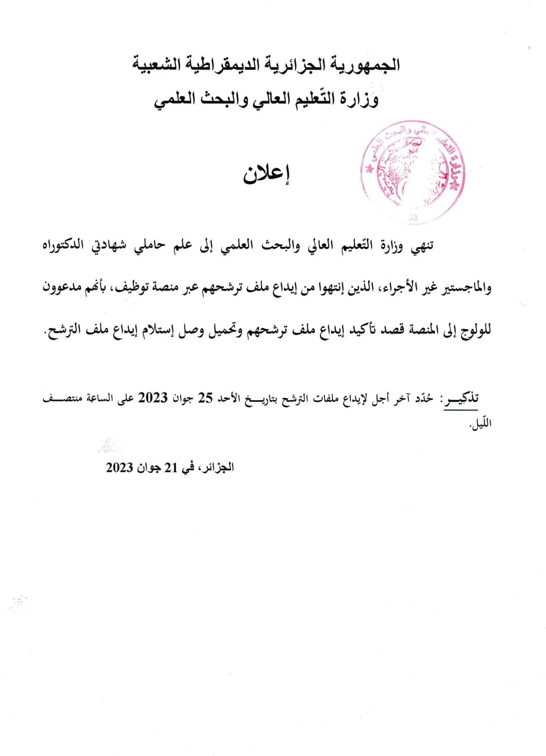 دعت وزارة التعليم العالي حاملي شهادتي الدكتوراه والماجستير غير الأجراء، الذين انتهوا من إيداع ملف ترشحهم عبر منصة توظيف إلى تأكيد ترشحهم.
