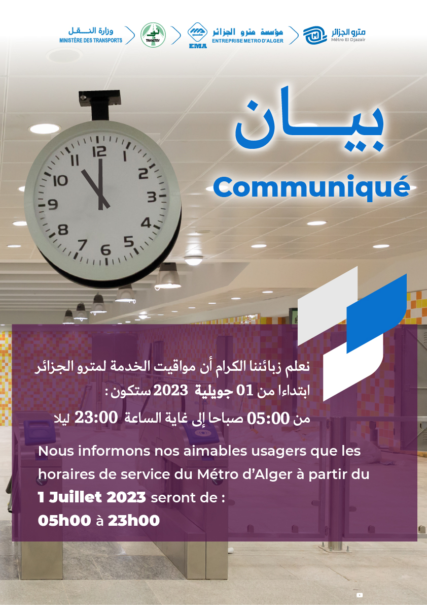 أعلنت مؤسسة مترو الجزائر عن توقيت برنامج رحلاتها الجديد الذي سيبدأ العمل به بداية من السبت المقبل الموافق للفاتح من شهر جويلية.