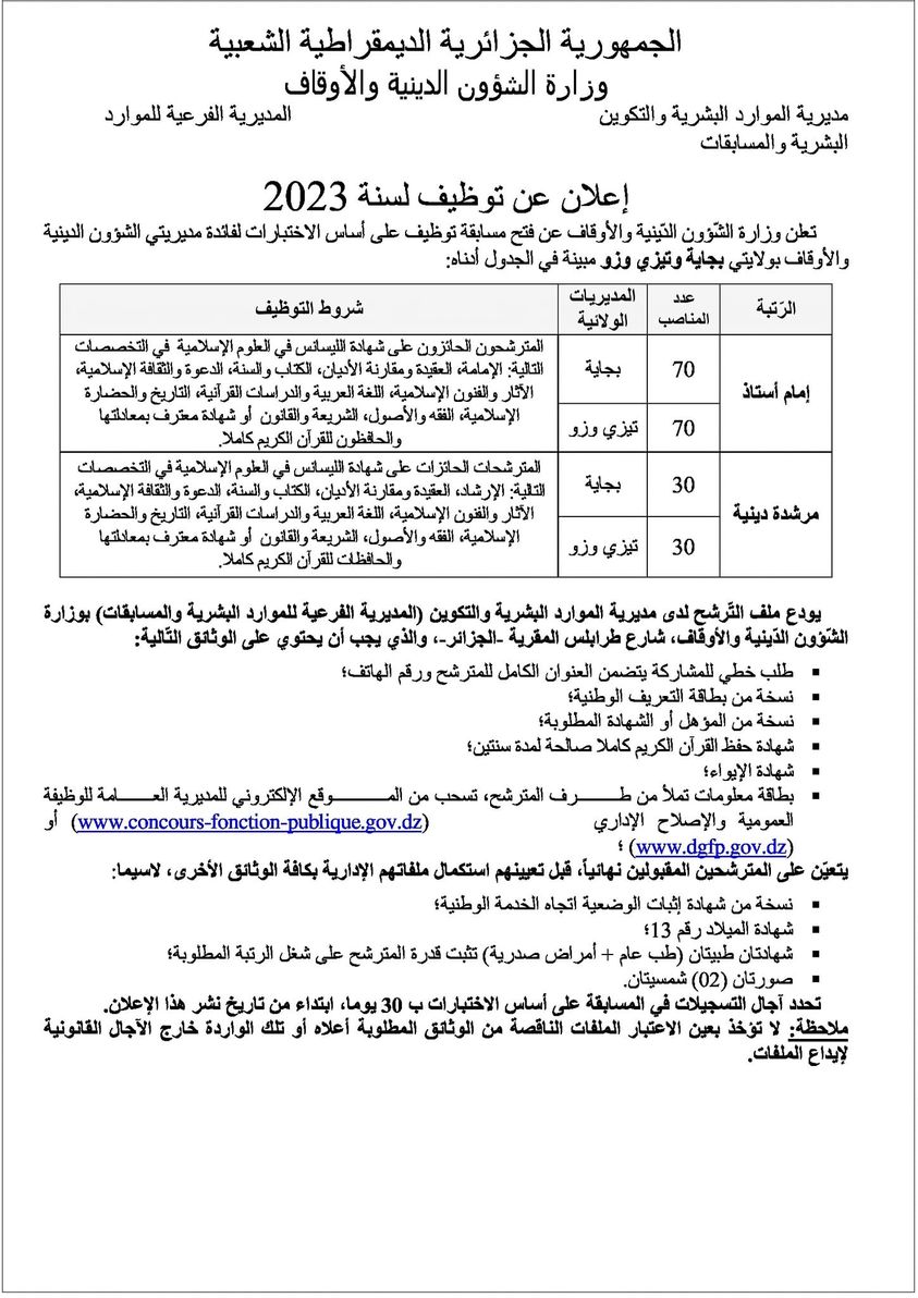 أعلنت وزارة الشؤون الدينية والأوقاف، عن فتح مسابقة توظيف 200 إمام ومرشدة دينية بولايتي بجاية وتيزي وزو.