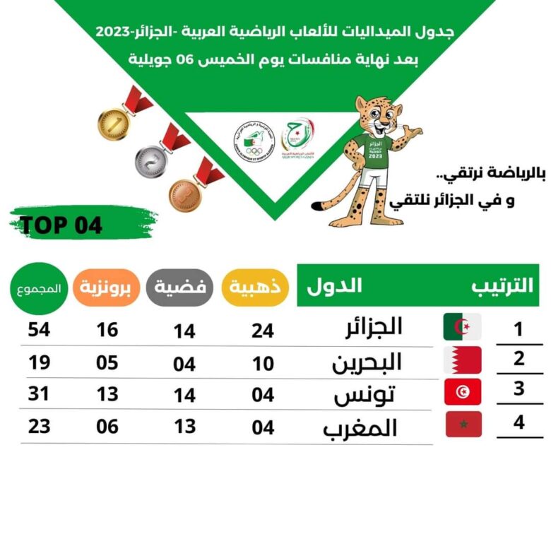 وتستمرّ تظاهرة الألعاب العربية نسخة الجزائر 2023، إلى غاية الـ 15 من جويلية الحالي.