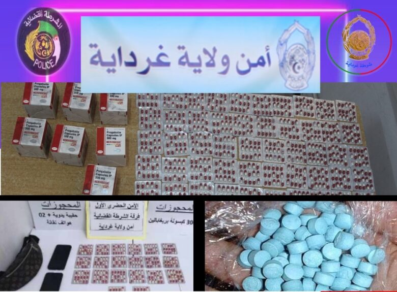 في عمليات أمنية متفرقة نفذت مؤخراً بإقليم ولاية غرداية تمكنت قوات الشرطة من الإطاحة بـ 13 شخص في قضايا متعلقة بحيازة مؤثرات عقلية لغرض البيع والترويج، مع حجز إجمالي 1165 كبسولة من المؤثرات العقلية من نوع بريغابالين 300 ملغ و ما يقارب 100 قرص صلب من نوع إكستازي.