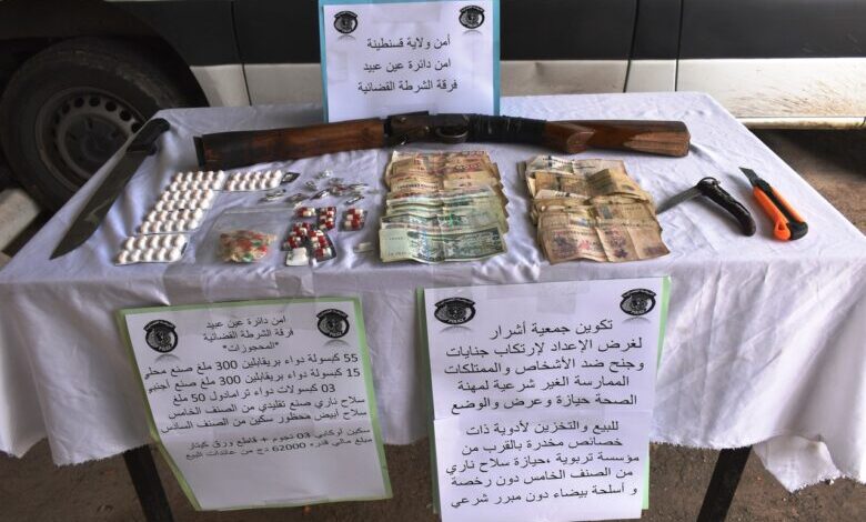 تمكنت قوات الشرطة بأمن دائرة عين عبيد بولاية قسنطينة، من توقيف شخصين يبلغان من العمر 31 و 38 سنة ، متورطان في قضية تكوين جمعية أشرار لغرض الإعداد لارتكاب جنايات وجنح ضد الأشخاص والممتلكات ، الممارسة غير الشرعية لمهنة الصحة ، حيازة وعرض والوضع للبيع والتخزين لأدوية ذات خصائص مخدرة بالقرب من مؤسسة تربوية ، حيازة أسلحة بيضاء محظورة دون مبرر شرعي.