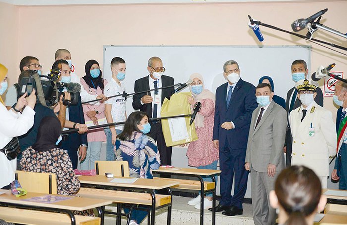 وتوجه للمترشحين بالقول: “على الرغم من هذه التداعيات، فإن جائحة فيروس كورونا جعلتنا نتخذ إجراءات تمكننا من أن نحمي أنفسنا ونحافظ على صحتنا وصحة الأشخاص المحيطين بنا”، كما شجع الوزير الأول المترشحين وحثهم على “الكتابة بطريقة جيدة وخط واضح”، مشيرا إلى أن الكتابة الجيدة تسهل فهم المحتوى، قبل أن يتحدث مع بعض أساتذة ومؤطري البكالوريا بمركز الإجراء متوسطة شايب العربي وشجعهم على المضي قدما قائلا لهم: “يجب أن تكونوا فخورين بهذه المهنة، فالأستاذ يكون أجيال المستقبل والأستاذ الصالح يخلق مجتمعا صالحا”.
