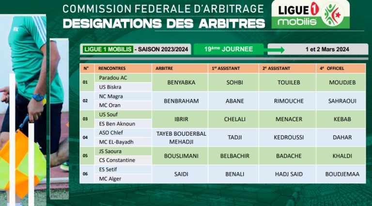 عيّنت اللجنة الفيدرالية للتحكيم، حكام مباريات الجولة الـ19 من الرابطة المحترفة الأولى، وستلعب مباريات الجولة الـ19 يومي الجمعة والسبت باستثناء لقاءي اتحاد خنشلة وشباب بلوزداد، واتحاد العاصمة وشبيبة القبائل، بسبب ارتباط الشباب والاتحاد بالمنافسة الإفريقية.