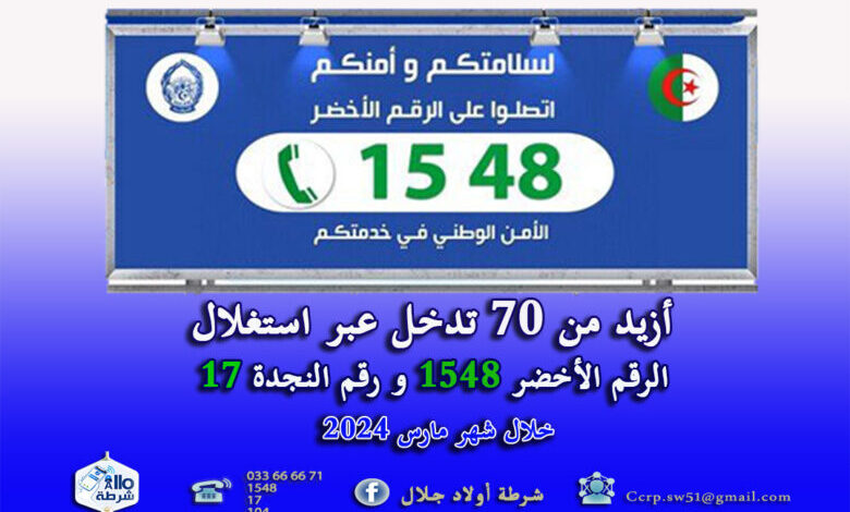 أين سجلت قوات الشرطة العاملين على مستوى قاعات العمليات خلال شهر مارس من سنة 2024 استقبال عدد معتبر من المكالمات عبر مختلف خطوطها الخضراء والمجانية 1548… 17…104… استغلت مجملها في تنفيذ أزيد من 70 تدخل ، و التي مكنت من تحقيق نتائج إيجابية الأمر الذي ساهم بالقدر الأوفر في إضفاء فعالية خلال عمليات الشرطة و المداهمات الأمنية المبرمجة لكبح الجريمة وتوقيف المشبوهين لتقديمهم أمام الجهات القضائية.