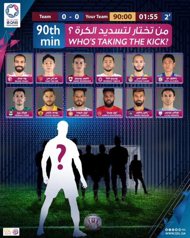 وكتب الصفحة الرسمية للهيئة الكروية عبر صفحتها الرسمية على تويتر: “حصل فريقك على ركلة حرة مباشرة في الدقيقة 2+90، من اللاعب الذي سوف تختاره لتنفيذها؟”.