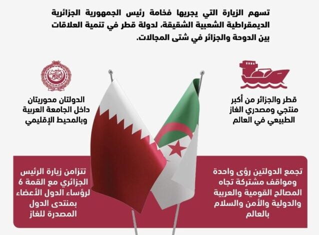 وتسهم الزيارة والمباحثات المقرر اجراؤها في تطوير وتعزيز العلاقات بين الدوحة والجزائر في شتى المجالات، وتقديم المزيد من الدعم والإسناد للقضايا العربية والدولية التي يتشارك البلدان حيالها رؤى واحدة ومتطابقة.